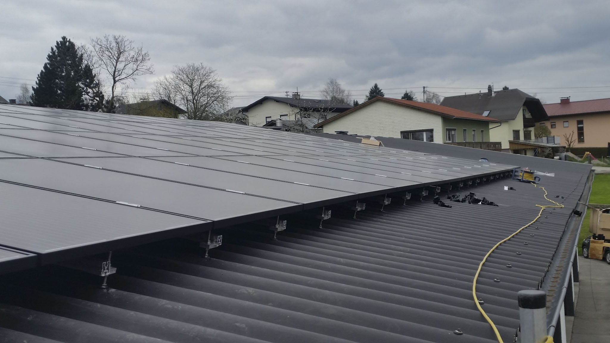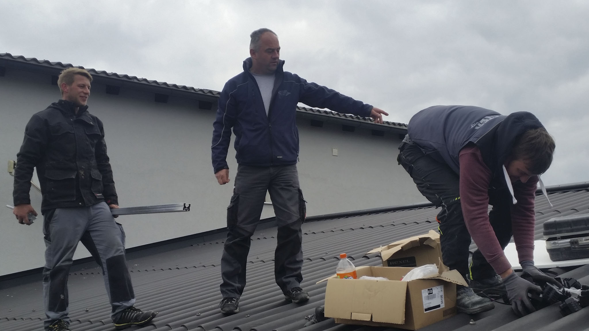 Installation einer Photovoltaikanlage auf einen Welleternitdach mit Inbetriebnahme der dazugehörigen Wechselrichter und Energiespeicherkomponenten.