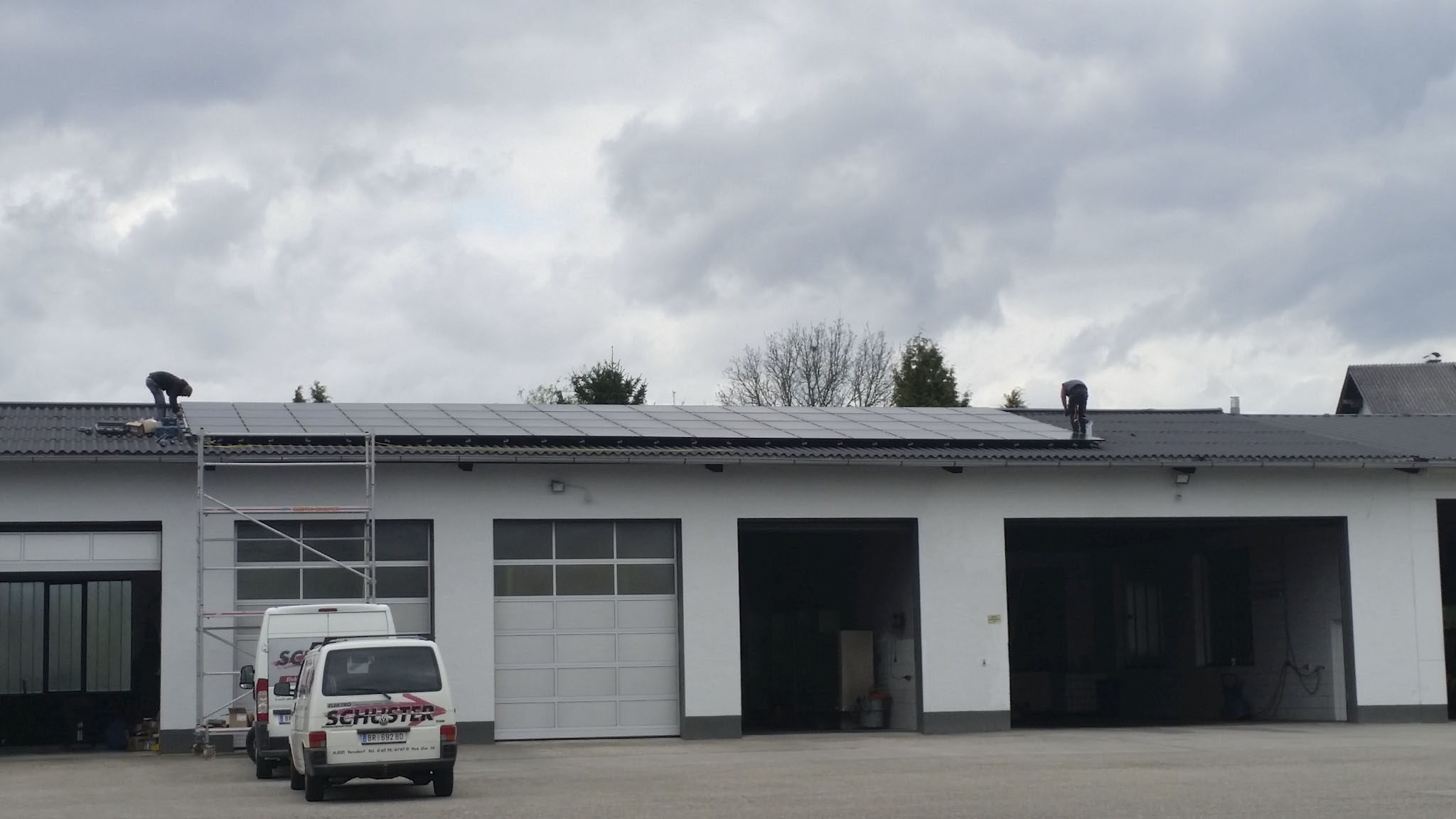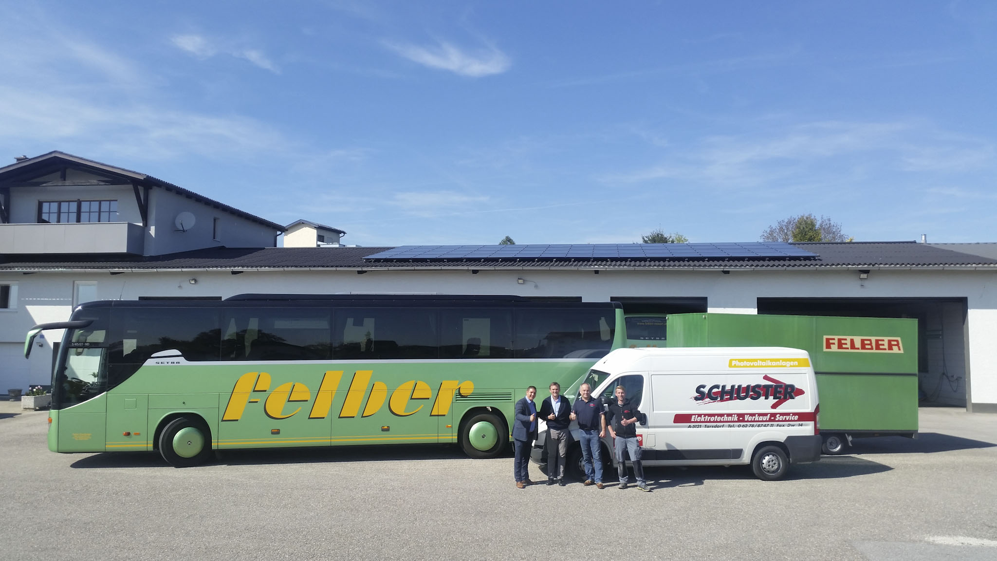 Norbert Schuster(r.) nach erfolgreicher Inbetriebnahme einer Photovoltaik Anlage mit Fronius Wechselrichter beim Ostermiethinger Reisebusunternehmen Felber